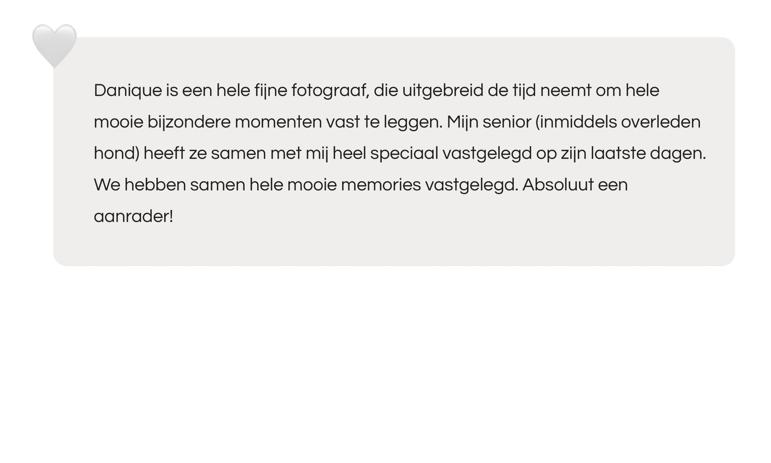 Danique is een hele fijne fotograaf, die uitgebreid de tijd neemt om hele mooie bijzondere momenten vast te leggen. Mijn senior (inmiddels overleden hond) heeft ze samen met mij heel speciaal vastgelegd op zijn laatste dagen. We hebben samen hele mooie memories vastgelegd. Absoluut een aanrader!
