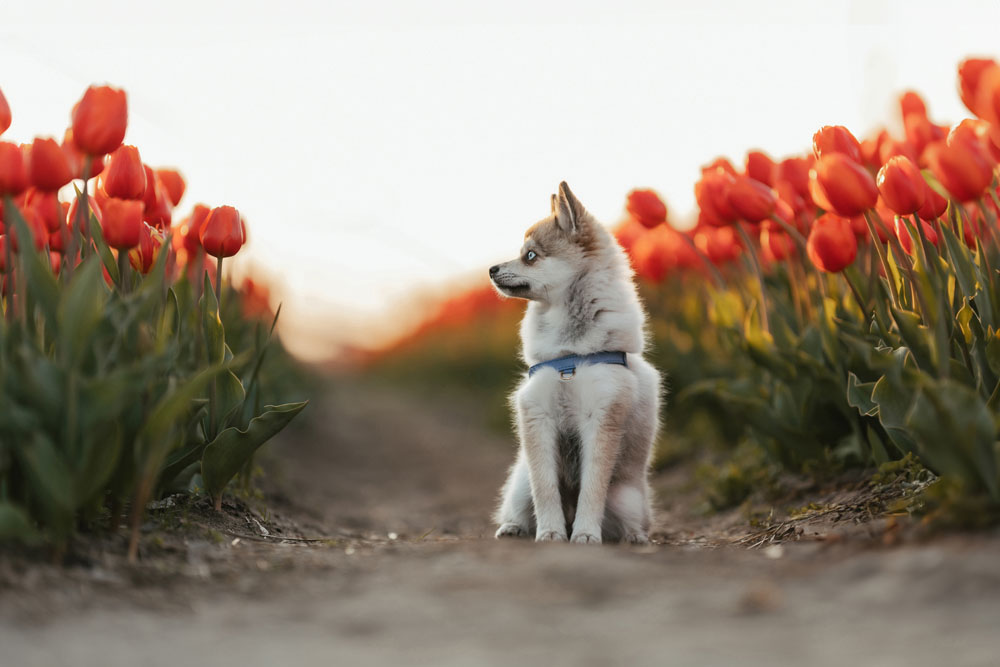 Tussen de rijen kleurrijke tulpen mocht ik Skylar fotograferen – een pomsky van nog maar 4 maanden oud. Zo klein en zo knap met haar helderblauwe oogjes.
